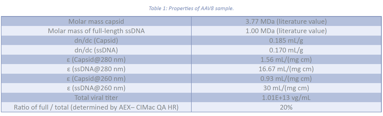 The AAV8 sample was generated, purified, and provided by Sartorius BIA Separations. The AAV8 sample was purified using cation-exchange (CEX) chromatography on a strong CEX monolithic column – CIMmultus SO3 1 mL preparative column with 2 μm channels (Sartorius BIA Separations). The AAV8 sample with encapsidated ssDNA cargo was analyzed using Postnova's AF2000 Multi Flow FFF system, equipped with UV-DAD, multi-angle light scattering (MALS), refractive index (RI), and dynamic light scattering (DLS) detectors. The analysis was performed with 1× PBS (pH 7.4) as the carrier solution. The sample stream was concentrated fourfold using the Smart-Stream-Splitting module. A 20 μL aliquot of the AAV sample was injected into a standard AF4 channel containing a 10 kDa NovaRC membrane and a 350 μm spacer. Table 1 lists the sample properties, including the nominal molar masses of the empty capsid and ssDNA payload. The values for refractive index increments (dn/dc) and extinction coefficients were used for the compositional analysis, which was performed using NovaAnalysis Software. The ratio of full to total AAV8 capsids (vg/cp) was additionally determined by anion-exchange (AEX) chromatography, using a strong AEX monolithic column – CIMac QA HR 0.1 mL analytical column with 2 μm channels (Sartorius BIA Separations).