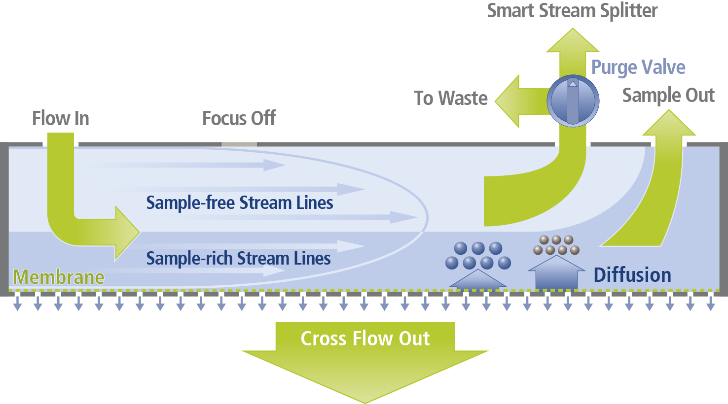In AF4, the separation mechanism results in the sample being located in the lower part of the fractionation channel. This means that at the detector outlet the sample is diluted by the upper, sample-free, part of the flow. Using S3 removes the upper, sample-free part of the channel flow and allows only the lower, sample-rich part of the channel flow to go to the detectors (Sample Out in Figure 1). The result is that increased analyte concentration passes through the detectors and therefore generates higher detector signal (see Figure 1).