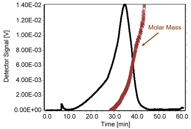 Figure 3: Molar mass profile overlay with 90° LS fractogram indicating size-based separation. Actual molar mass values withheld for confidentiality reasons.