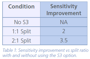 The S3 option is used in this example to demonstrate the flexibility of this technology and the successful improvement of the sensitivity of the analysis by simply changing the split ratio. The overlay of the 90° LS fractograms of the same sample with and without using the S3 option and using a split ratio of 1:1 and 2:1 is demonstrated in Figure 2, and the sensitivity improvement in the peak height is summarized in Table 1.